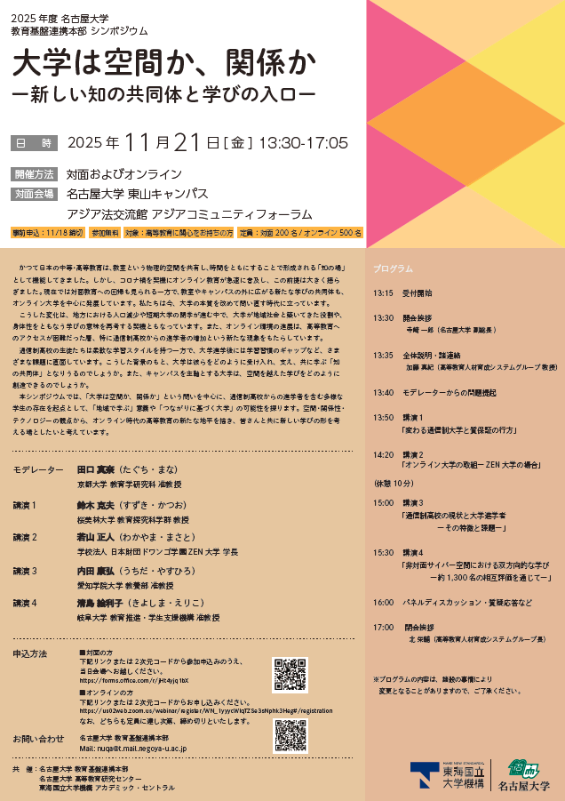 通信制高校の生徒たちは柔軟な学習スタイルを持つ一方で、大学進学後には学習習慣のギャップなど、さまざまな課題に直面しています。こうした背景のもと、大学は彼らをどのように受け入れ、支え、共に学ぶ「知の共同体」となりうるのでしょうか。また、キャンパスを主軸とする大学は、空間を越えた学びをどのように創造できるのでしょうか。 本シンポジウムでは、「大学は空間か、関係か」という問いを中心に、通信制高校からの進学者を含む多様な学生の存在を起点として、「地域で学ぶ」意義や「つながりに基づく大学」の可能性を探ります。空間・関係性・テクノロジーの観点から、オンライン時代の高等教育の新たな地平を描き、皆さんと共に新しい学びの形を考える場としたいと考えています。